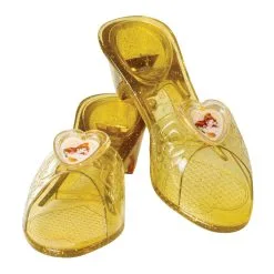 - Soft plastic gold shoe with slight heel and glittery design throughout plus light up function in the heel