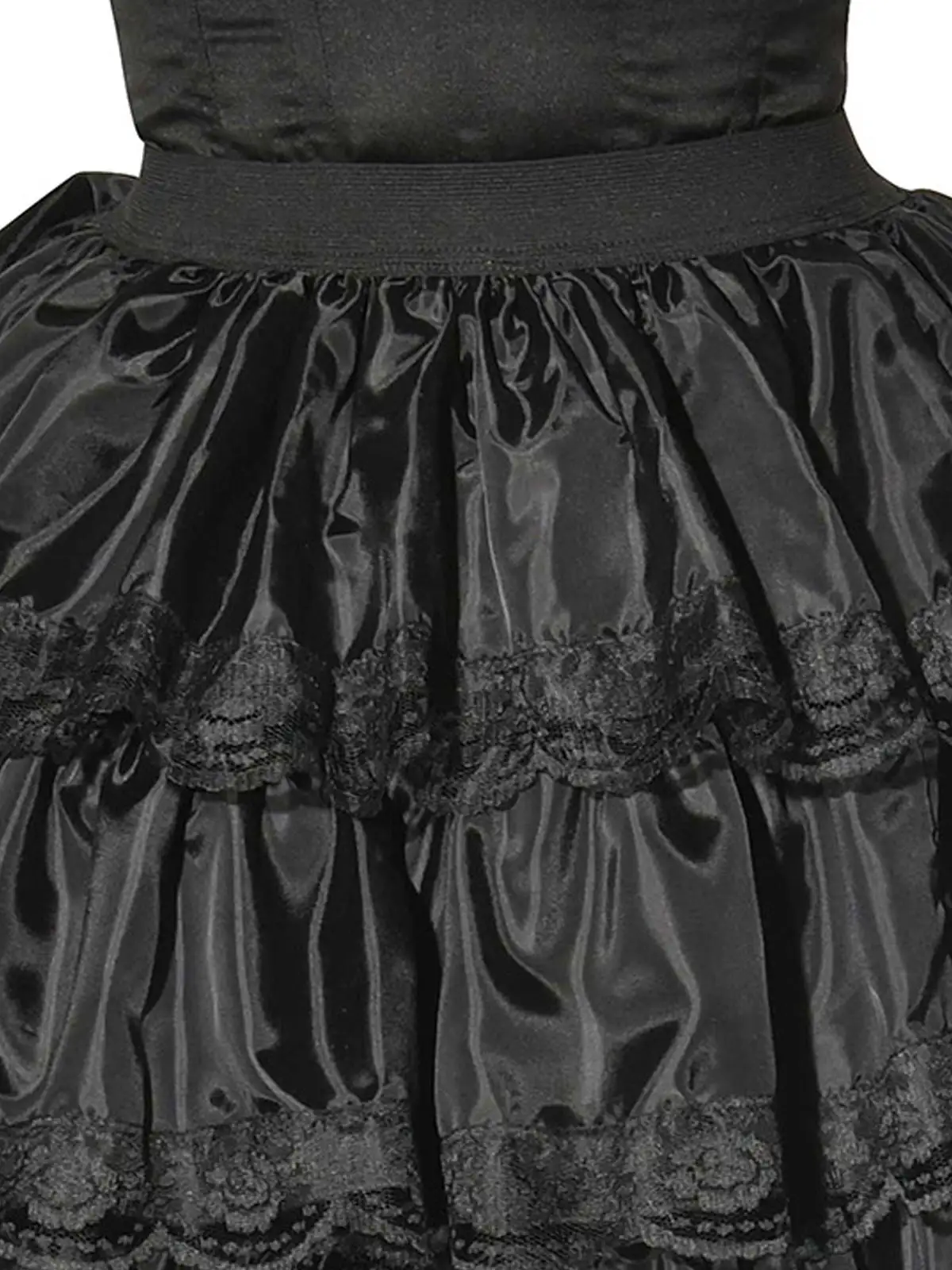 - Skirt features lace at each layer of hem and an elastic waistband for comfort