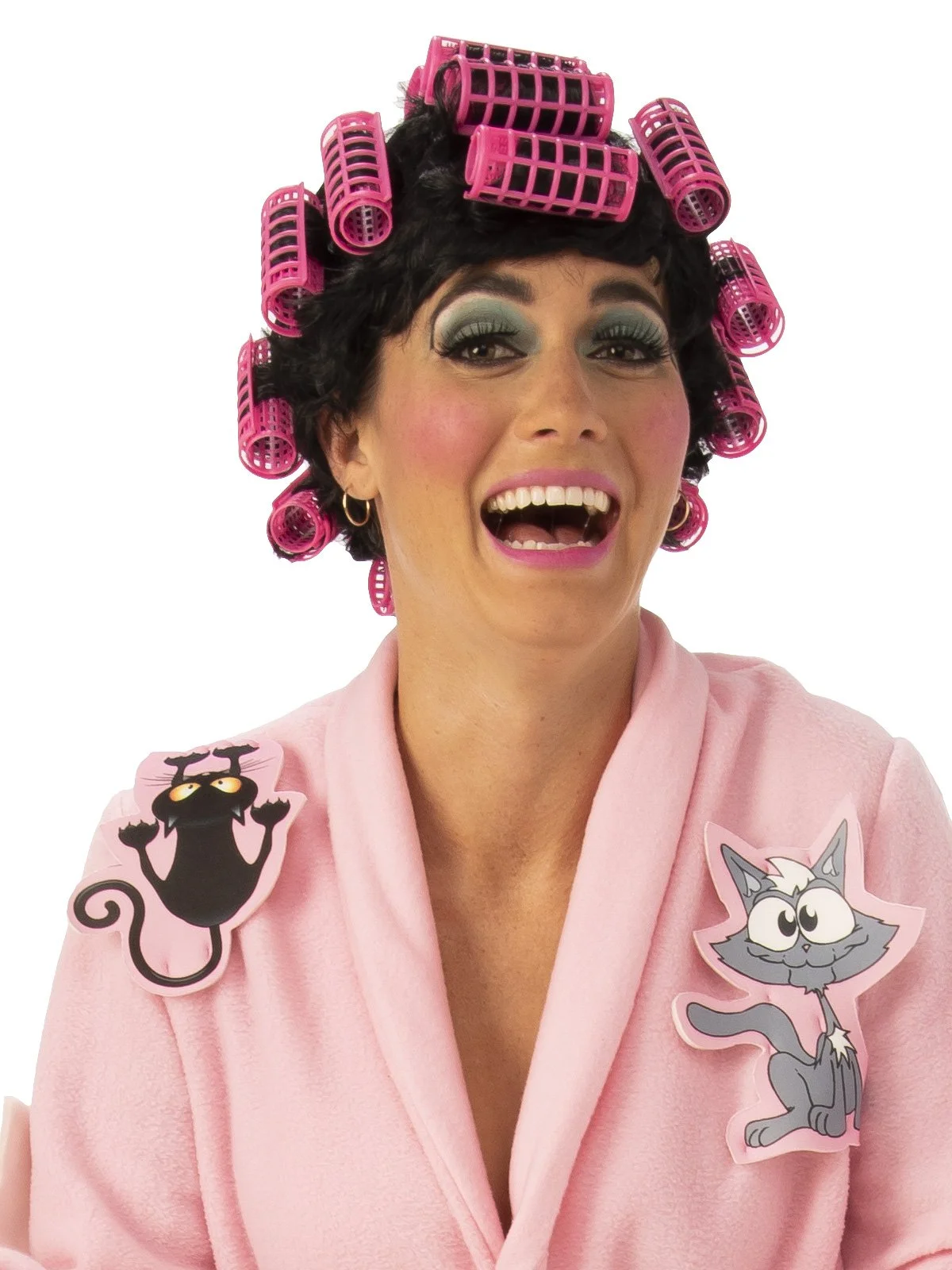 - Black curly wig made from polypropylene hair strands and attached plastic pink curlers