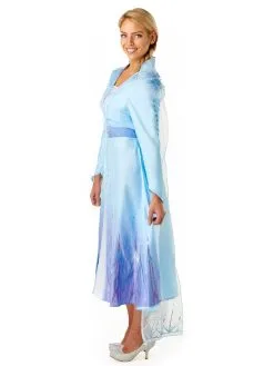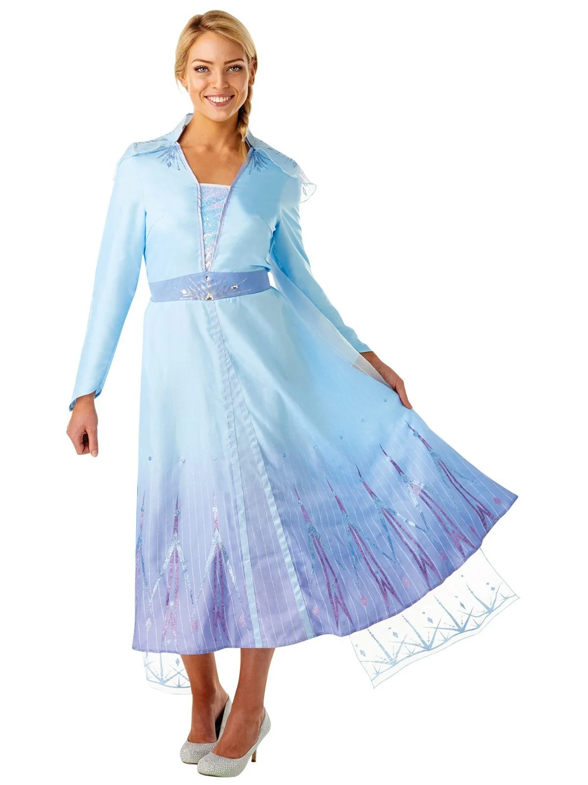 - Detachable digitally printed sheer cape features high collar plus a glittery snowflake design at top and hemline. Cape attaches with velcro tabs at the dress collar and drapes down to ankle height in two flowing sections