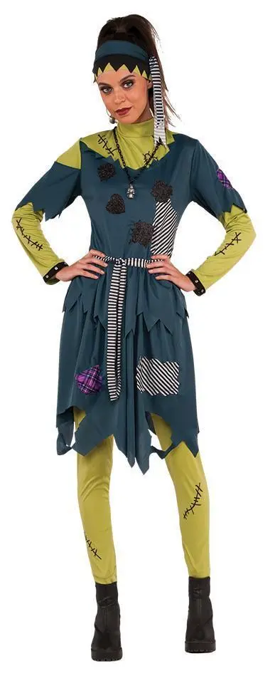 - Dress has long sleeves and printed stitch detail to look like wounds plus high collar with trademark plastic silver bolts at neck