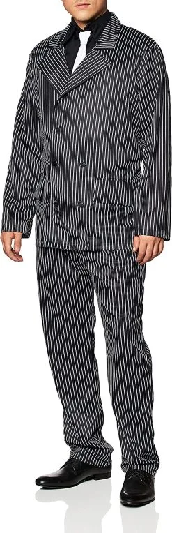 Ever want to be Al Capone? Then consider this Adult Gangster Costume with its classic double-breasted pinstripe suit, reminiscent of the gangsters of old. With this smart white tie, and coordinating ensemble, you will ooze cool and street smarts. Go back in time to the 1920’s and 30’s with this great adult men’s costume, and experience the fun of gangster living for one night at your next Halloween.
