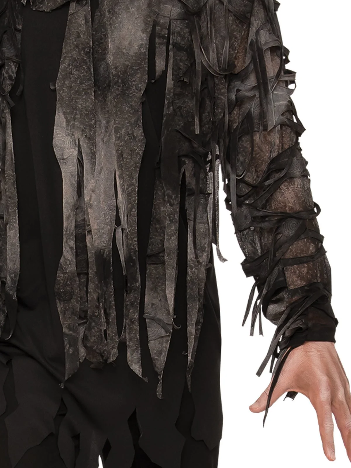 - Hooded shirt with heavy fabric pieces attached and rips and tears throughout