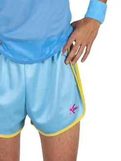 - Electric blue sports shorts with yellow trim and metallic pink Ken Logo
