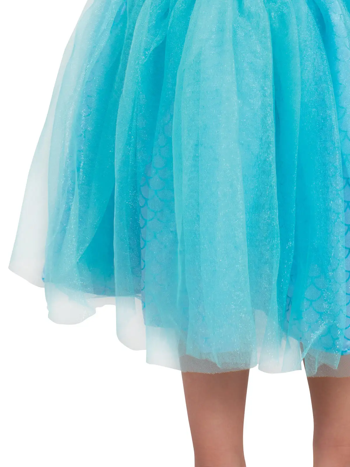 - Satin sleeveless mini dress with character art of Mercat on the torso and glittery tulle sleeve detail