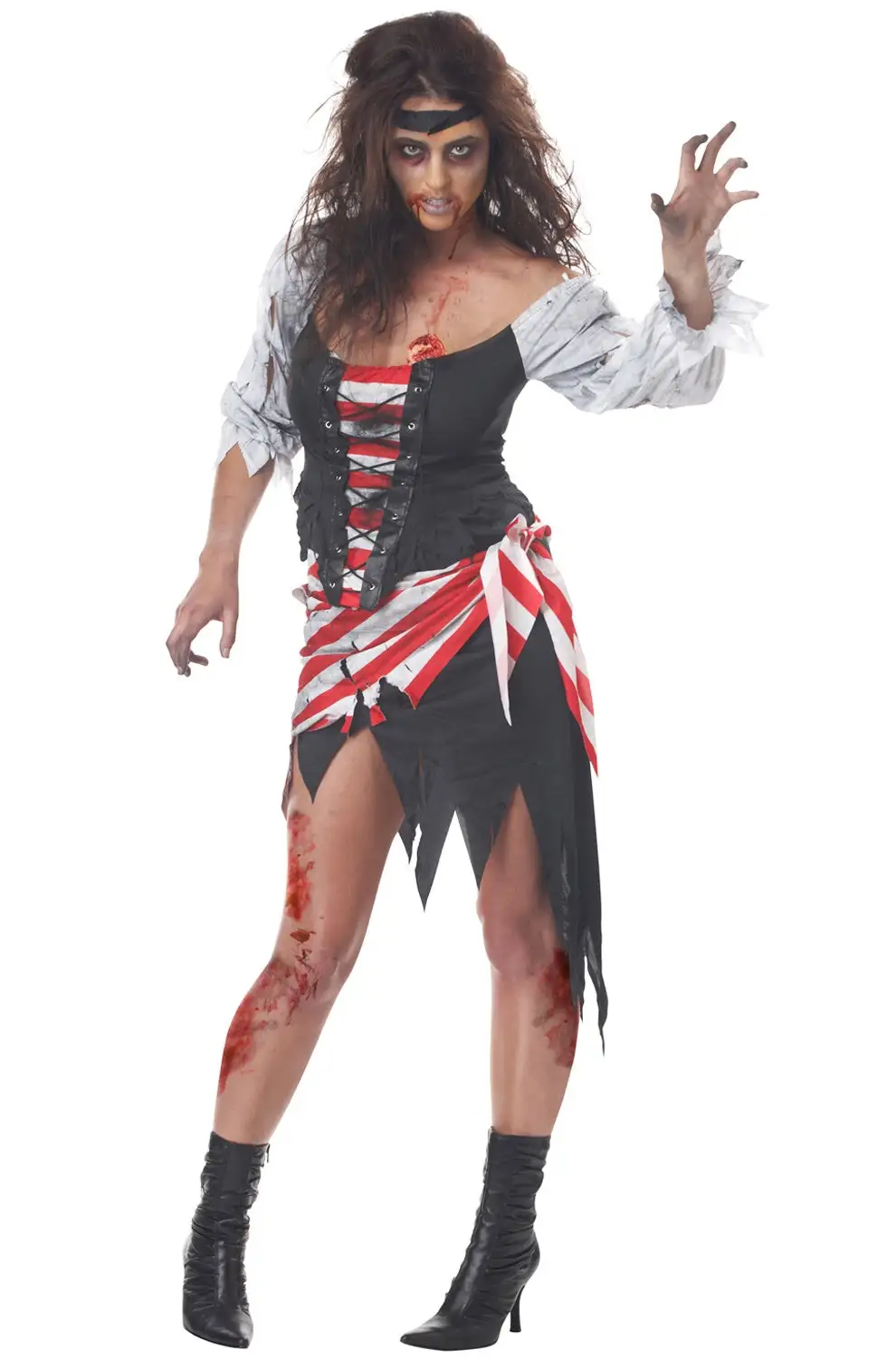 Pillaging and plundering will be on your agenda when you wear this sexy pirate outfit! This one of as kind lady pirate outfit consists of a corset-style top, a mid-length skirt with a jagged cut trim, a black and white striped waist sash, and a matching head tie to top the outfit off.