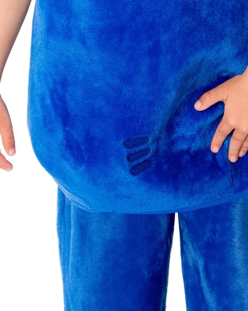 - Hooded faux fur top in bright blue with attached heapdiece and padded tummy. Two digitally printed felt buttons are on the back