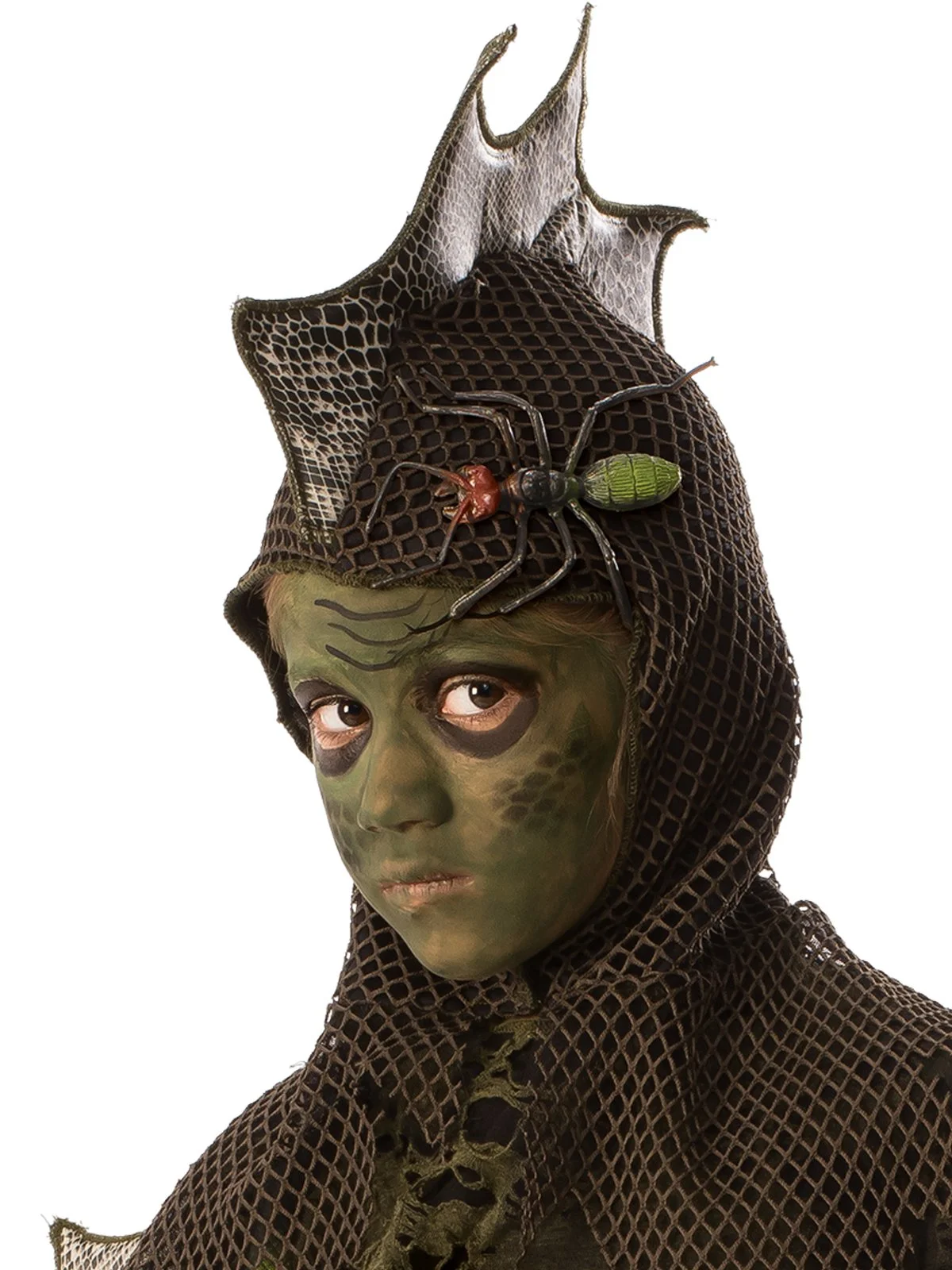 - Hood in netted fabric with shaped and printed crest over the top plus novelty spider attached